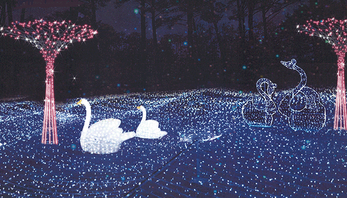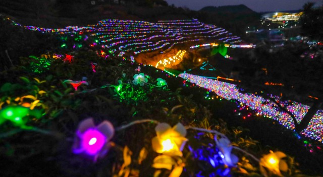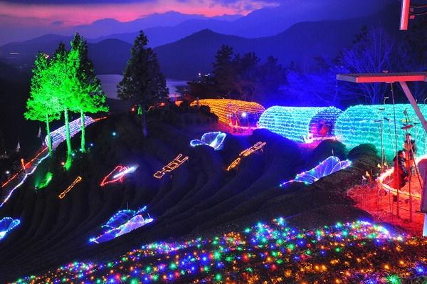 “겨울밤, 차밭 위로 쏟아지는 빛의 향연을 느껴보세요.”